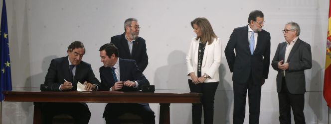 Los máximos líderes patronales y sindicales junto al presidente del Gobierno, Mariano Rajoy, y la ministra de Empleo, Fátima Báñez, durante la firma del último acuerdo sobre medidas para activar el mercado laboral.